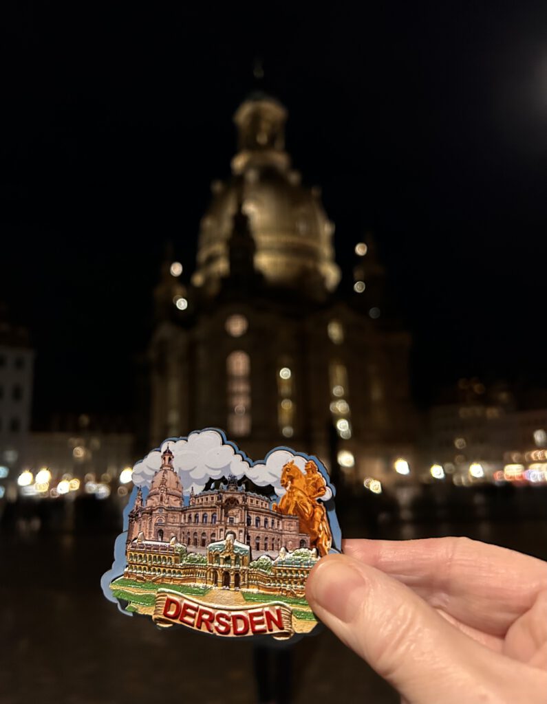 Weit im unscharfen Hintergrund (fern) sorgt die echte Dresdner Frauenkirche im Lichterglanz für eine atmosphärische Tiefe und ein weiches Bokeh. Den scharfen Vordergrund (nah) dominiert hingegen ein klassischer Souvenir-Magnet, der die Wahrzeichen der Stadt auf wenigen Zentimetern komprimiert.